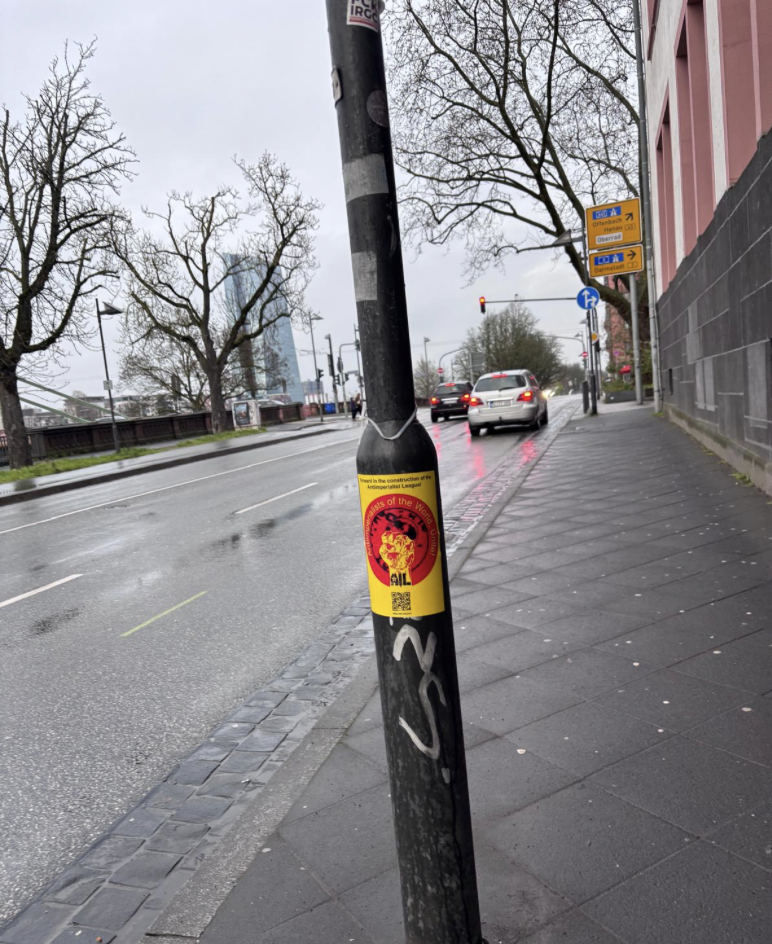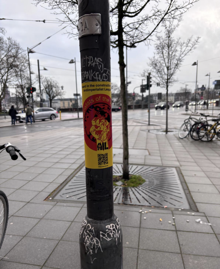 In addition, call posters prepared for the founding congress of the Antiimperialist League (AIL), which will take place on April 3–4–5, 2026 in Ecuador, were put up in the streets of Frankfurt.