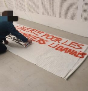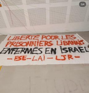 As part of a solidarity campaign for Lebanese prisoners held in Israel, activists carried out a symbolic action. They hung a banner in front of a branch of the Croix-Rouge in Saint-Denis to draw attention to the conditions of detention of political prisoners.