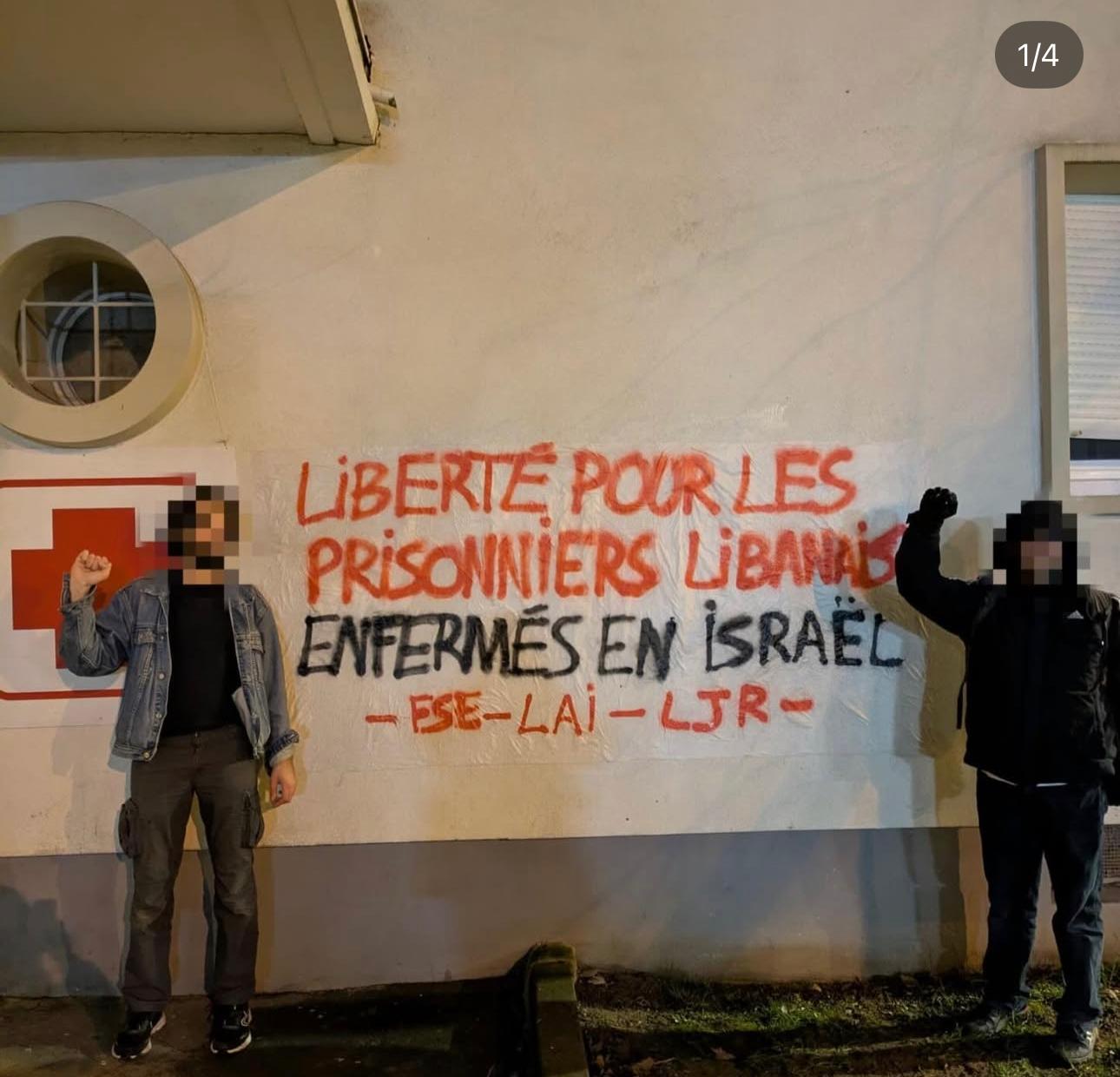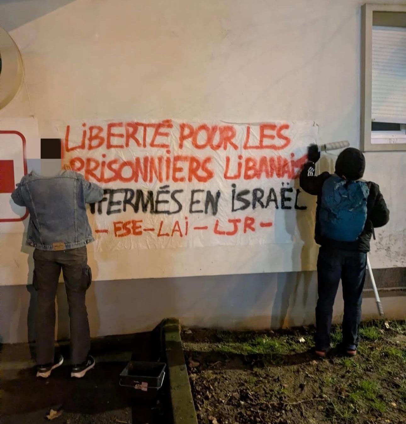 As part of a solidarity campaign for Lebanese prisoners held in Israel, activists carried out a symbolic action. They hung a banner in front of a branch of the Croix-Rouge in Saint-Denis to draw attention to the conditions of detention of political prisoners.